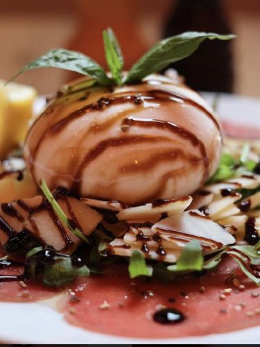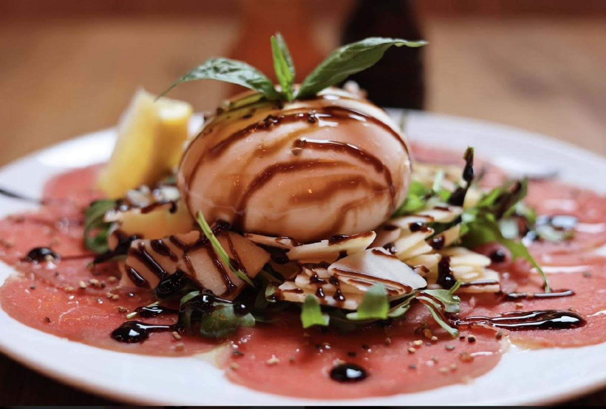 Black Angus légèrement fumé en Carpaccio & copeaux de parmesan, Burrata, roquettes, crème balsamique