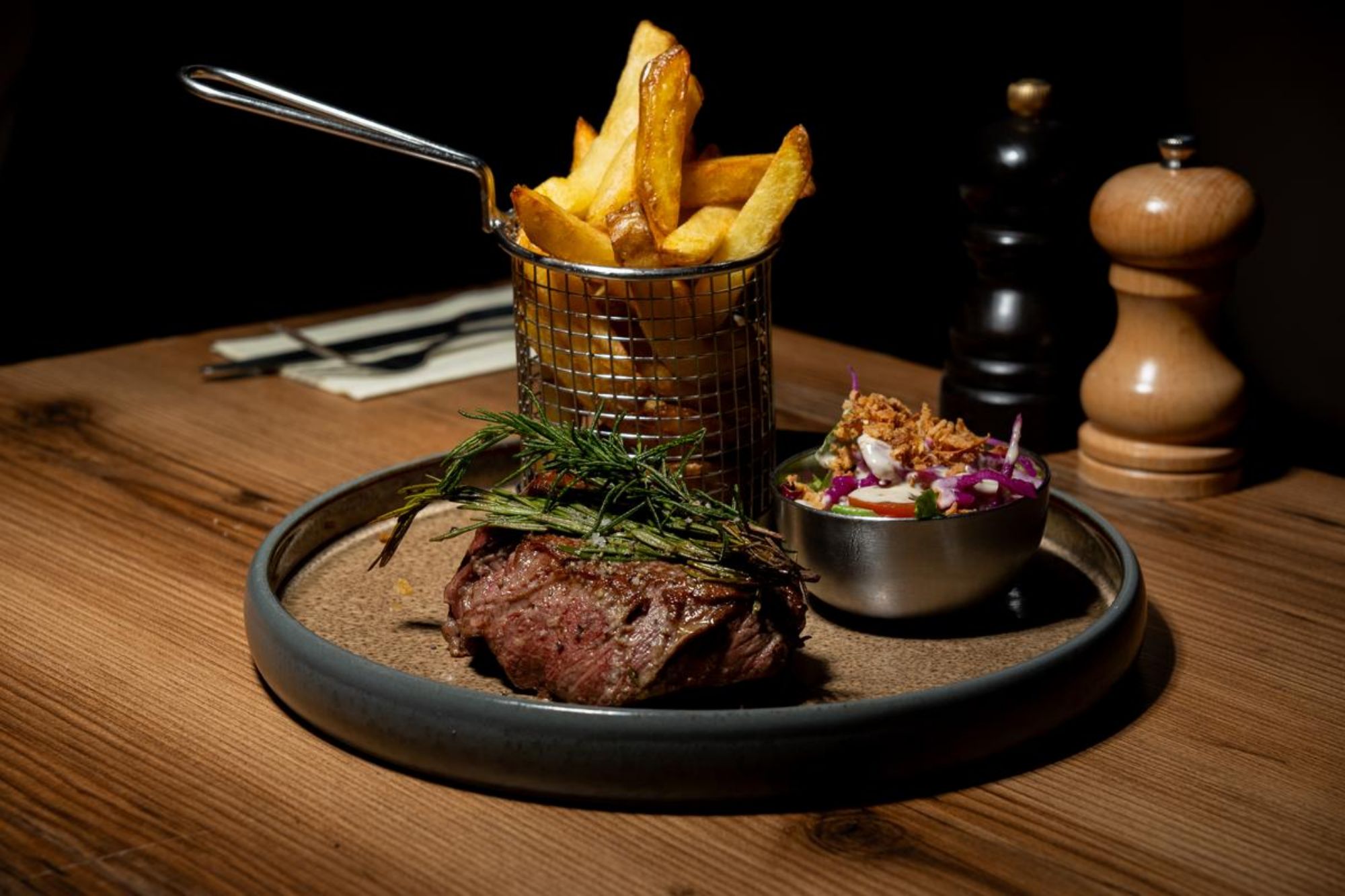 Sauces au choix : sauce au poivre, sauce archiduc ou sauce caramélisée • Accompagnement au choix : purée maison, frites fraîches ou frites de patate douce.